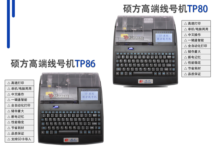 由于扩展硕方品牌的影响力,同时也为了和进口品牌的线号机一较高下,硕方公司出品了TP80和TP86这两款高端线号机产品,无论在外观还是内部结构的材料使用上面,都非常的完美。而且做工方面也非常的细致,打印质量方面也很过硬。